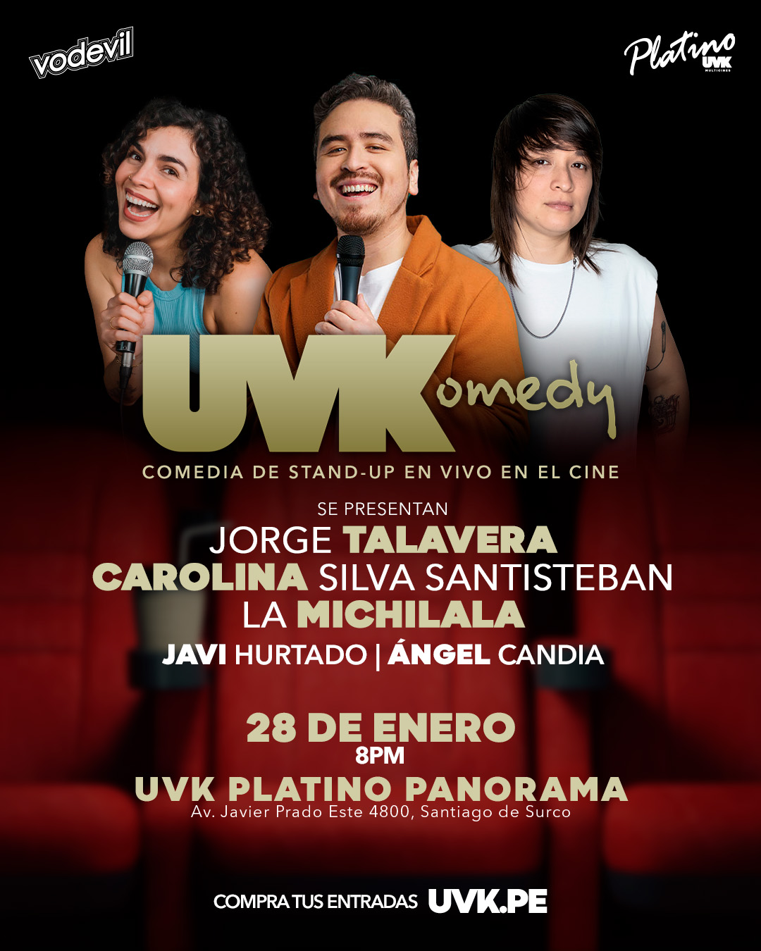 ¡Risas garantizadas, butaca incluida. La stand-up se apodera de la pantalla grande con UVKomedy, una experiencia única solo por tiempo limitado. En cada función, un lineup de lujo del stand-up se luce con sus mejores rutinas: Mateo Garrido Lecca, Job Mansilla, Max Santiváñez, Carolina Silva Santisteban, La Michilala, Chapasa, Poper, y más invitados que no dan tregua a la risa. Si te gusta la stand-up, este es tu plan.